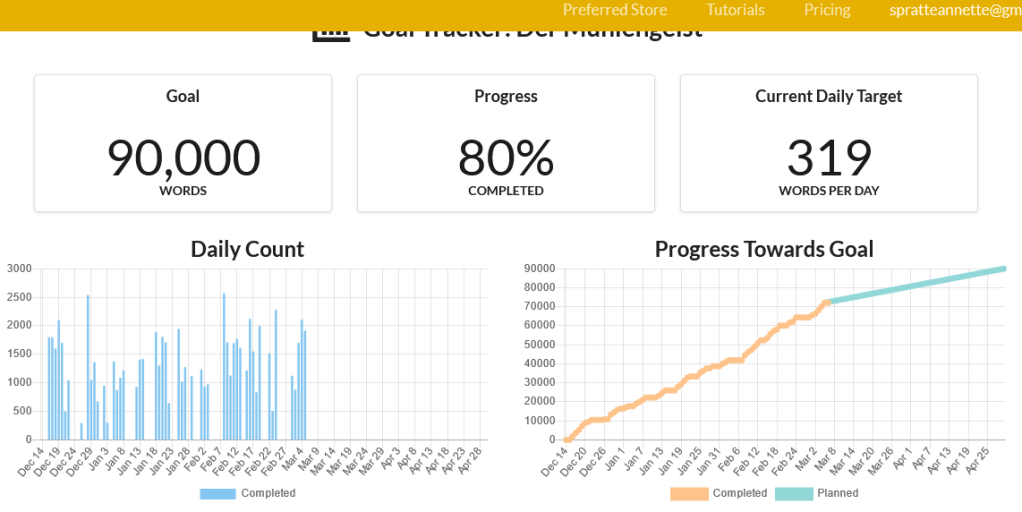 Zusätzlich kam erschwerend hinzu, dass meine Gesundheit mich mehr als einmal lahmgelegt hat. Müdigkeit, Konzentrationsprobleme und mehrere Migräneattacken über drei Tage verhinderten das Vorankommen. Ihr seht die Lücken in der Grafik links. Wenn man die Grafik rechts realistisch betrachtet, bin ich trotz allem schon weit gekommen: Von den bis Ende Februar angepeilten 80000 Wörtern (das sind ungefähr 300 Buchseiten) hatte ich Mitte Februar knapp 60000 erreicht. Doch das Ende der Geschichte lag noch in weiter Ferne und ab März hatte ich den nächsten Übersetzungsauftrag zugesagt. Also habe ich mein Schreibziel einfach verschoben. Jetzt stehen 90000 Wörter bis Ende April im Plan. Das entspannt mich deutlich.