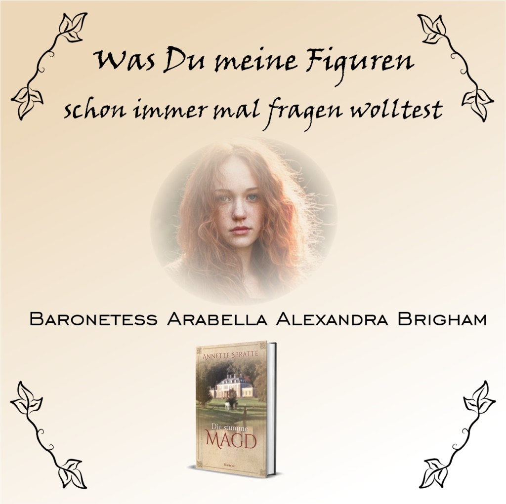 Bei meinem heutigen Plausch ist eine ziemlich beeindruckende Frau zu Gast: Baronetess Arabella Alexandra Brigham, die euch vielleicht aus dem Roman Die stumme Magd bekannt ist. Wenn ihr diesen Roman noch nicht gelesen habt, seid bitte gewarnt, dass dieses Interview Spoiler enthält!