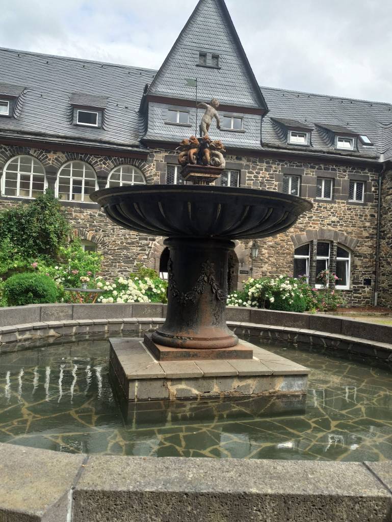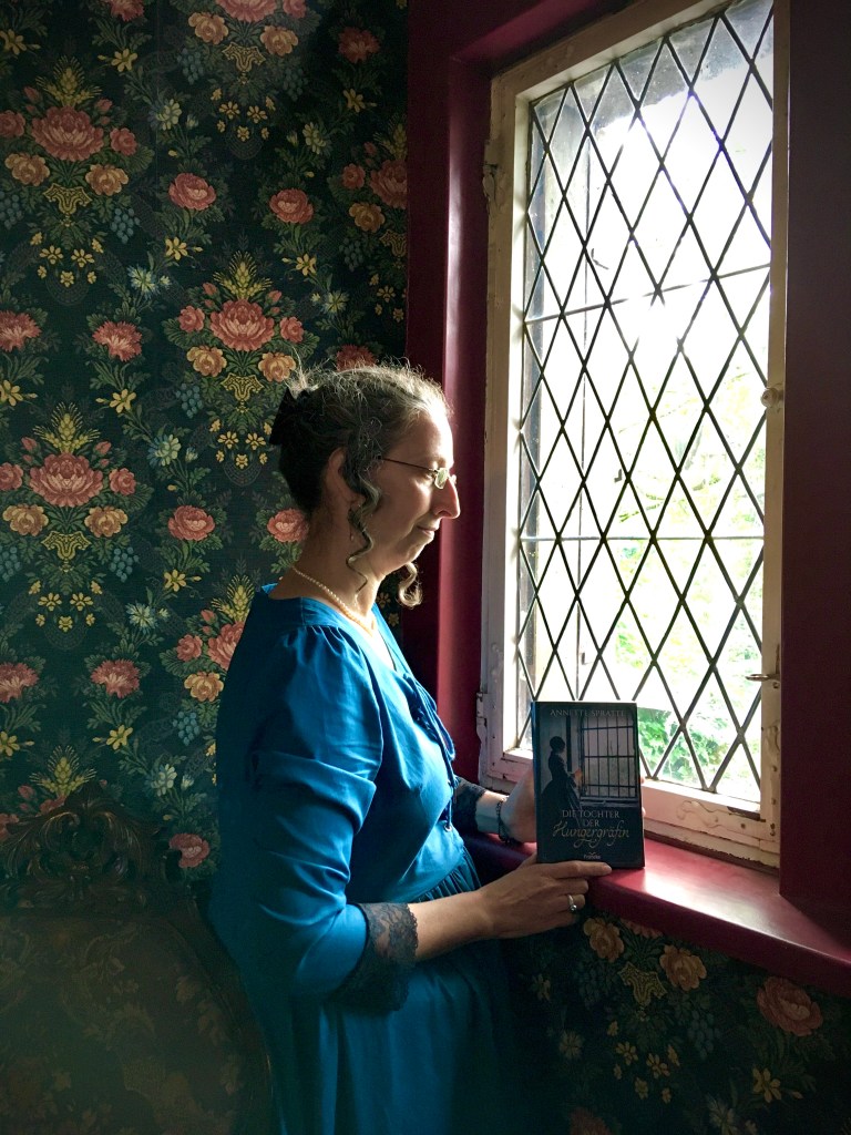 The story setting moves back and forth between three castles in the former county of Sayn, all three of which still exist. The Freusburg fortress was turned into a youth hostel, where I have spent a few nights some years ago. Friedewald castle is privately owned and was closed to the public for a long time. It was re-opened in 2022 and turned into an event location. It was a marvellous experience to be invited to read from the book in the castle courtyard. For the occasion, I dressed in 17th century garb and was able to reproduce the German book cover!