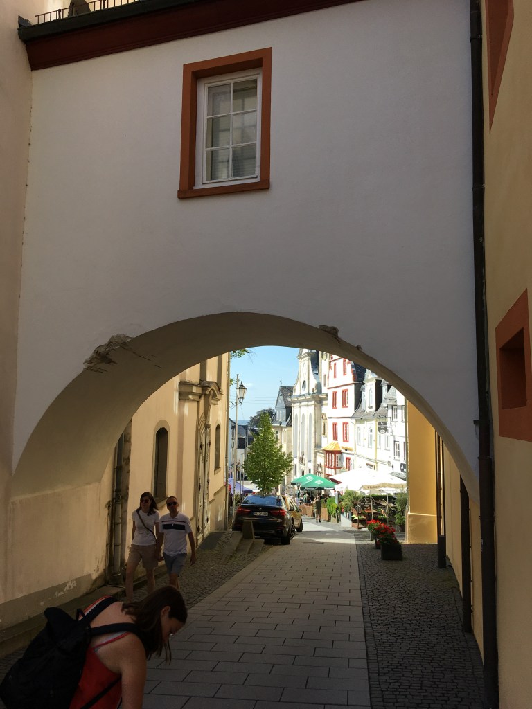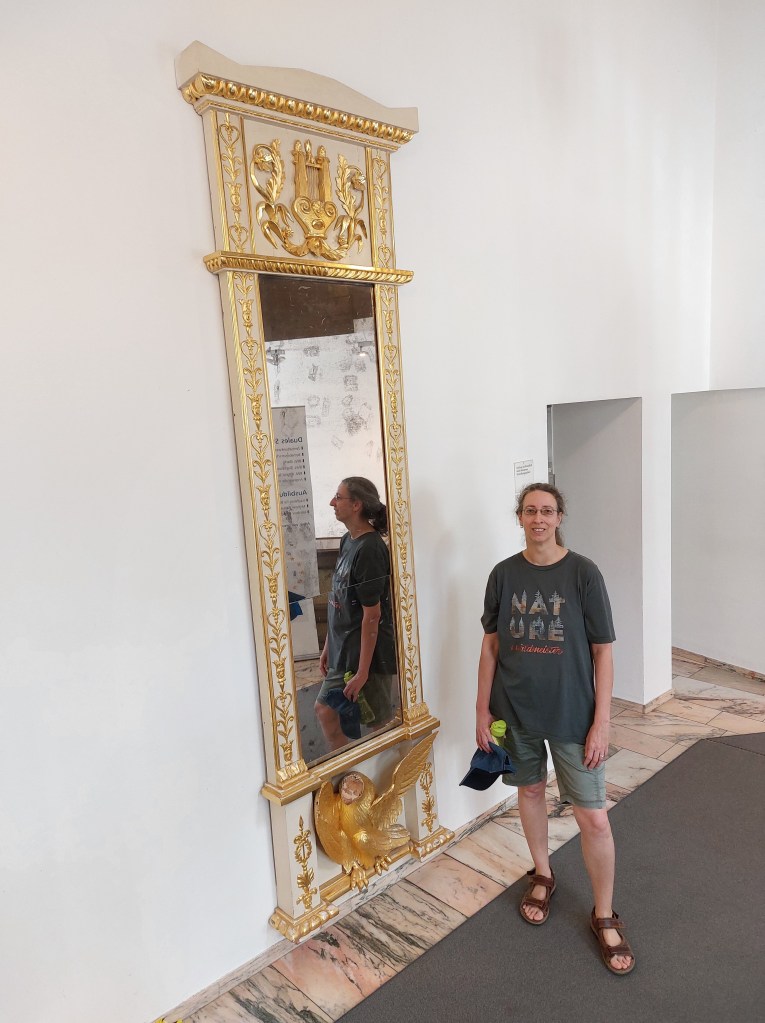 From left to right (top to bottom): 1 – the archway connecting the church and the castle, 2 – inner courtyard of the castle, 3 – outer courtyard looking at the entrance gate, 4 – myself in front of an old guilded mirror, 5 – excerpt of the pedigree depicting my protagonists and their coats of arms, 6 – close up of the archway looking down onto the market square. Looks like some truck driver overestimated the height of the arch.