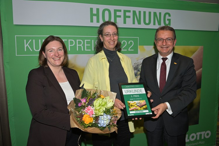 Meine ersten beiden Teilnahmen an Schreibwettbewerben brachten mir direkt zwei Platzierungen ein. Sowohl die Kurzgeschichte zum Thema Helden als auch das Sonett der Hoffnung schafften es auf Platz 5 des Lotto Kunstpreises. Hier seht ihr mich bei der Preisverleihung in Koblenz 2022 mit Kulturministerin Katharina Binz und Lotto Geschäftsführer Jürgen Häfner.